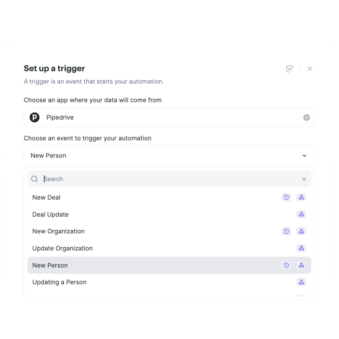 Select from 25+ triggers like “New WhatsApp message”, “Contact added to CRM”, or “Tag applied”. You can even use webhooks for custom triggers from any app.